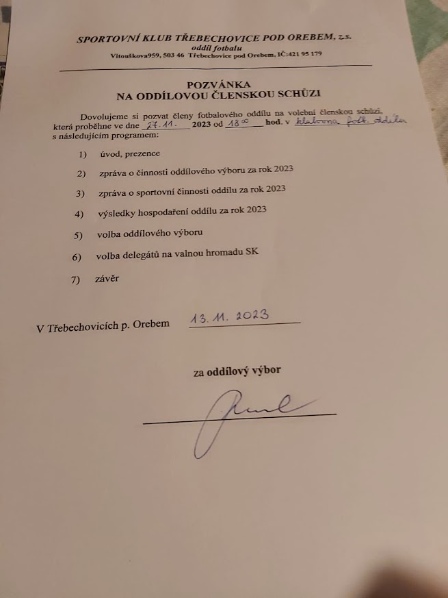 Dovolujeme si pozvat členy fotbalového oddílu na volební členskou schůzi, která proběhne ve dne 27.11.2023 od 18:00 v klubovně fotbalového oddílu s následujícím programem: